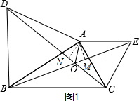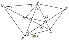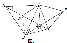 (4)通过△DAC≌△BAE,得到∠1=∠2,于是得到∠4=∠DAB=60°,如图2,作等边三角形BOF,由于△BDF≌△BAO得到DF=AO,于是证得结论;