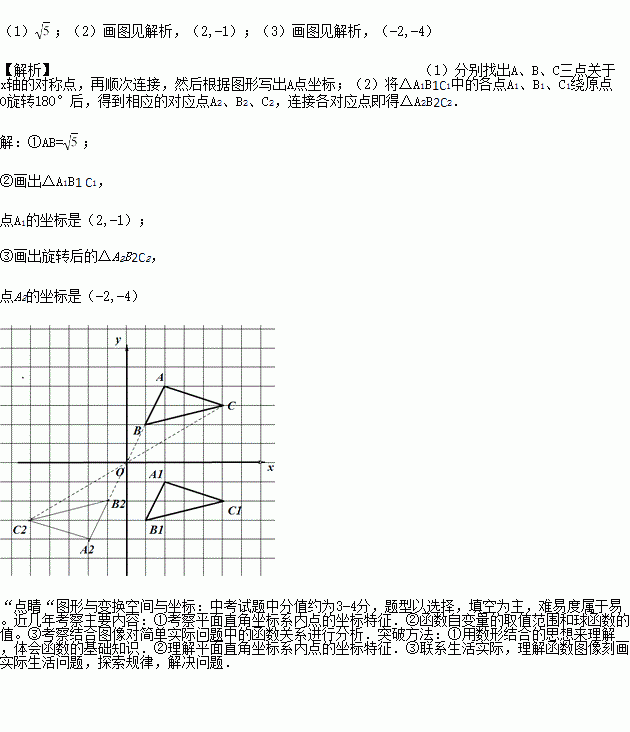 (3)画出△ABC绕原点O旋转180°后得到的△A2B2C2,并写出点A2的坐标 ;
