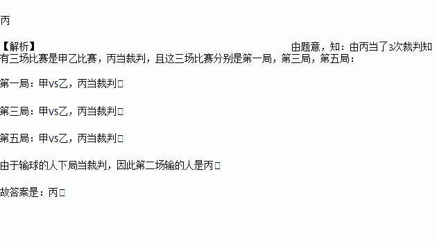 甲、乙、丙三人进行乒乓球比赛,规则是:两人比赛,另一人当裁判,输者将在下一局中担任裁判,每一局比赛没有平局.已知甲、乙各比赛了4局,丙当了3次裁判.则第二局的输者是________。