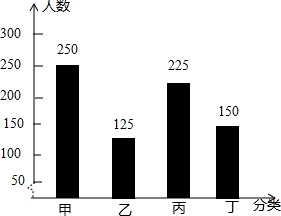 解答 解:(1)丙的圆心角360°×30%=108°,丁的圆心角360°×20%=72°;