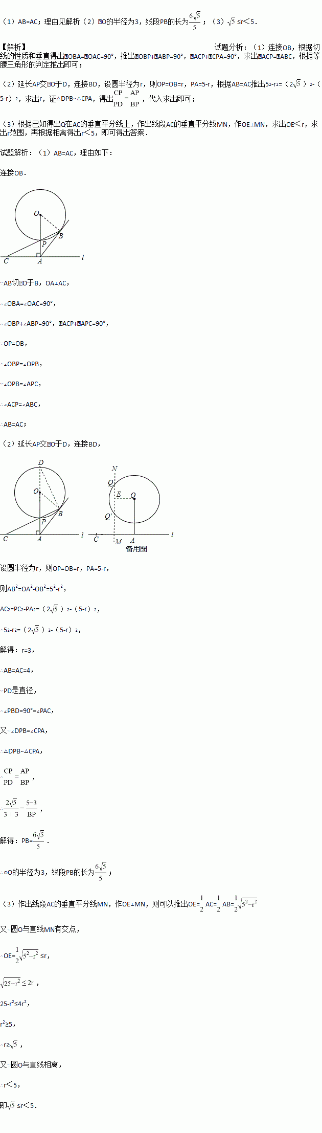 如图,已知直线l与⊙O相离,OA⊥l于点A,OA=5,OA与⊙O相交于点P,AB与⊙O相切于点B, BP的延长线交直线l于点C.