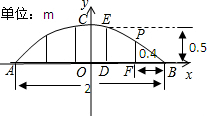 ·ÖÎö ½¨Á¢ÈçͼËùʾµÄÖ±½Ç×ø±êϵ£¬¸ù¾ÝÌâÒâµÃµ½Aµã×ø±êΪ£¨-1£¬0£©¡¢Bµã×ø±êΪ£¨1£¬0£©£¬Cµã×ø±êΪ£¨0£¬0.5£©£¬Dµã×ø±êΪ£¨0.2£¬0£©£¬Fµã×ø±êΪ£¨0.6£¬0£©£¬È»ºóÀûÓôý¶¨ÏµÊý·¨Çó³ö¶þ´Îº¯ÊýµÄ½âÎöʽ£ºÉè¶þ´Îº¯ÊýµÄ½»µãʽy=a£¨x-1£©£¨x+1£©£¬°ÑC£¨0£¬0.5£©´úÈëµÃa=-0.5£¬ÔòÅ×ÎïÏß½âÎöʽΪy=-0.5x2+0.5£¬È»ºó·Ö±ð°Ñx=0.2£¬x=0.6´úÈë¿ÉµÃµ½DE=0.48£¬FP=0.32£¬ÓÚÊǿɼÆËã³öÿ¶Î»¤À¸ÐèÒª²»Ðâ¸ÖÖ§ÖùµÄ³¤¶È£¬Ôٰѽá¹û³ËÒÔ100¼´¿ÉµÃµ½´ð°¸£®