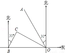 如图,港口B位于港口O正西方向120海里处,小岛C位于港口O北偏西60°的方向.一艘科学考察船从港口O出发,沿北偏西30°的OA方向以20海里/小时的速度驶离港口O.同时一艘快艇从港口B出发,沿北偏东30°的方向以60海里/小时的速度驶向小岛C,在小岛C用1小时装补给物资后,立即按原来的速度给考察船送去.