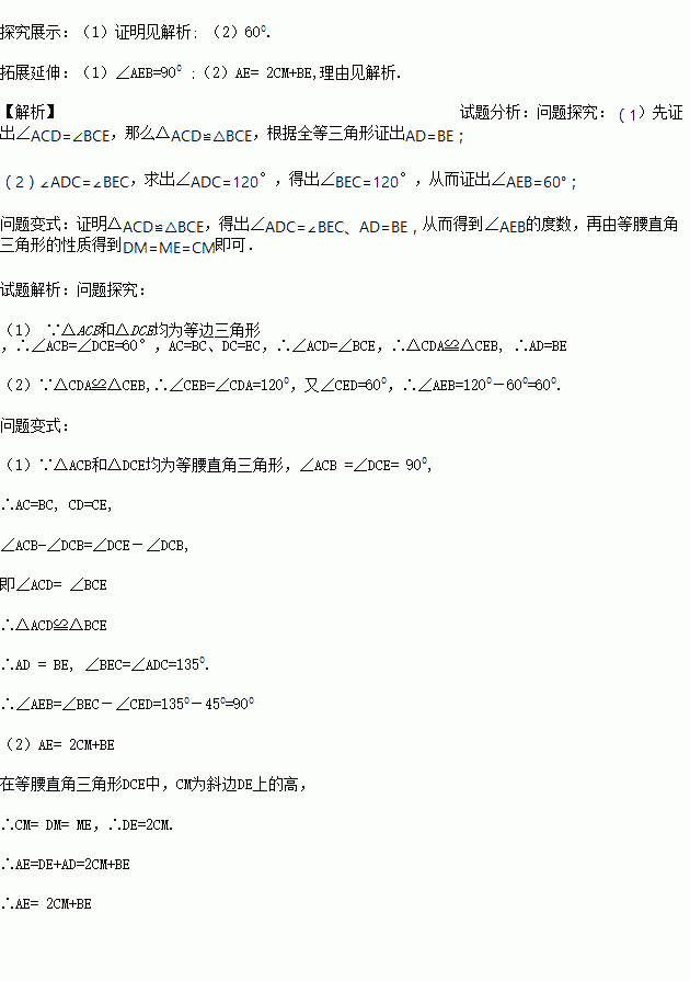(1)证明:AD=BE;(2)求∠AEB的度数.