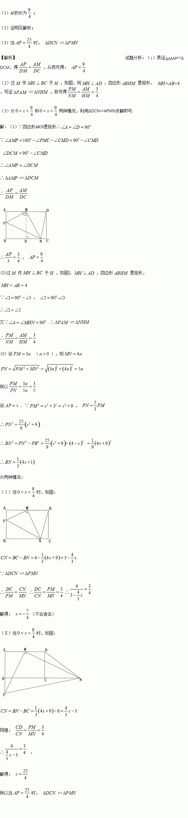 在矩形ABCD中,AB=4,AD=6,M是AD边的中点,P是射线AB上的一个动点(不与A、B重合),MN⊥PM交射线BC于N点.