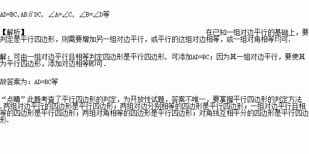 如图,已知AD∥BC,要使四边形ABCD为平行四边形,需要增加的一个条是:_____.(只填一个你认为正确的条件即可,不添加任何线段与字母)