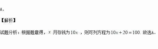 小明准备为希望工程捐款,他现在有20元,以后每月打算存10元.若设x月后他能捐出100元,则下列方程中能正确计算出x的是: