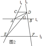 分析 (1)由AB∥CD,根据平行线的性质得到∠BAD=∠ADC,而l1∥l2,则CD∥EF,得到∠DEF=∠CDE,于是∠BAD+DEF=∠ADE;
