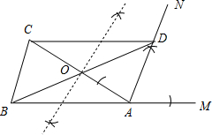 解:(1)作∠MAC的角平分线AN,作AC的中垂线得到AC的中点O,连接BO,并延长BO交AN于点D,连接CD,如图;