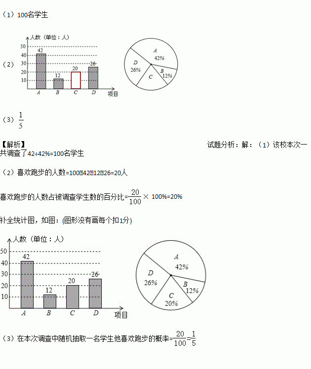 (3)在本次调查的学生中随机抽取1人,他喜欢“跑步”的概率有多大?