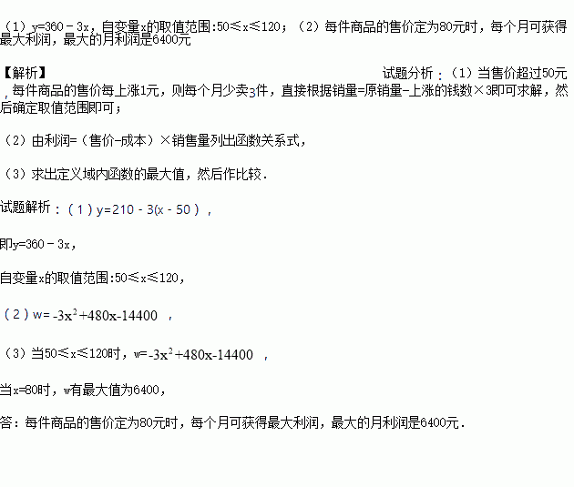 某商品的进价为每件40元,如果售价为每件50元,每个月可卖出210件;如果售价超过50元,每上涨1元,则每个月少卖3件.设每件商品的售价为x元,每个月的销售量为y件.
