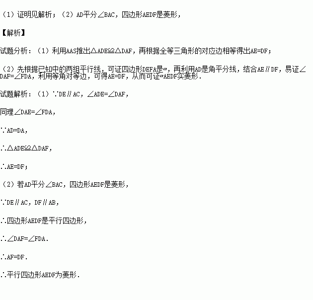 (2)若AD平分∠BAC,试判断四边形AEDF的形状,并说明理由.