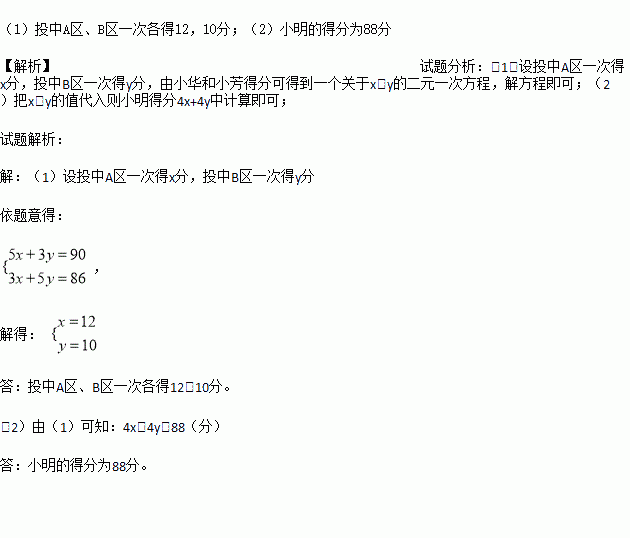 (1)求投中A区、B区一次各得多少分?