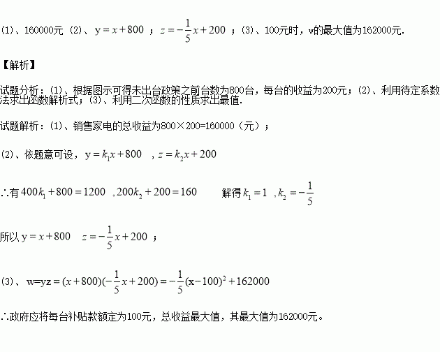 (3)要使该商场销售彩电的总收益w(元)最大,政府应将每台补贴款额x定为多少并求出总收益w的最大值。