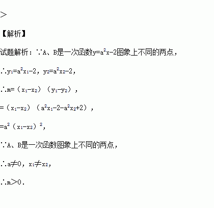 若A(x1,y1)、B(x2,y2)是一次函数y=a2x-2图象上不同的两点,记m=(x1-x2)(y1-y2),则m 0.(填“>”或“<”)
