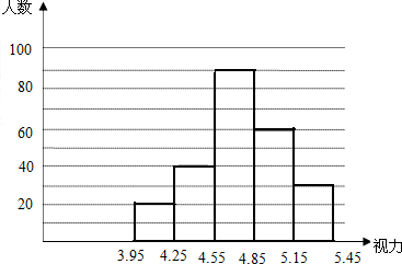 初中生的视力状况受到社会的广泛关注,某市有关部门对全市3万名初中生的视力状况进行了一次抽样调查,下图是利用所得数据绘制的频数分布直方图,根据图中所提供的信息回答下列问题:![]()