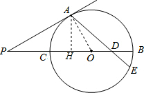 分析 过A作AH⊥BC于H,连接AO,利用三角函数求得AH=$\frac{1}{2}$AP=$\frac{\sqrt{6}}{2}$,由于PA是⊙O切线,得到AO⊥PA,解直角三角形的AO=$\sqrt{2}$,根据同圆的半径相等得到OD=OB=$\sqrt{2}$,由于D是OB中点,得到OD=BD=$\frac{1}{2}$OB=$\frac{\sqrt{2}}{2}$,CD=$\frac{3\sqrt{2}}{2}$,在RtAHO中,OH=$\sqrt{A{O}^{2}-A{H}^{2}}$=$\frac{\sqrt{2}}{2}$,在RtAHD中,AD=$\sqrt{A{H}^{2}+D{H}^{2}}$=$\frac{\sqrt{14}}{2}$,根据相交弦定理得到比例式AD•DE=CD•DB,于是求得结论.