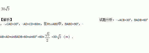 如图,测量河宽AB(假设河的两岸平行),在C点测得∠ACB=30°,D点测得∠ADB=60°,又CD=60m,则河宽AB为 m(结果保留根号).