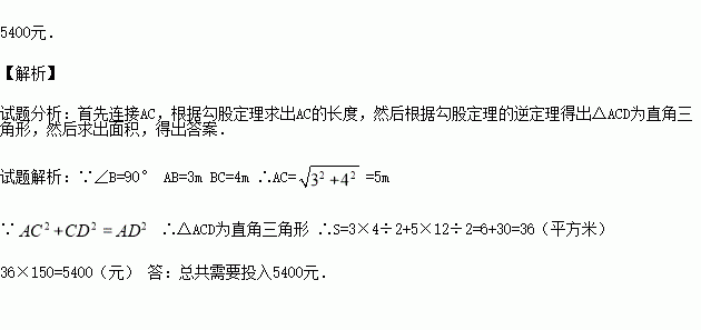 某开发区有一空地ABCD,如图所示,现计划在空地上种草皮,经测量,∠B=90°,AB=3m,BC=4 m,AD=13 m,CD=12 m,若每种植1平方米草皮需要150元,问总共需要投入多少元?