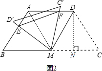 £¨2£©Á¬½ÓAM£¬ÓÉ£¨1£©Æ½ÐÐËıßÐÎABMDÊÇÁâÐΣ¬¡÷MAB£¬¡÷MADºÍ¡÷MC¡äD¡äÊǵȱßÈý½ÇÐΣ¬¸ù¾ÝASAÖ¤Ã÷¡÷BME¡Õ¡÷AMF£¬ÓÚÊǵõ½BE=AF£¬ME=MF£¬AE+AF=AE+BE=AB£¬½áºÏ¡ÏEMF=¡ÏDMC=60¡ã£¬¼´¿ÉÖ¤Ã÷¡÷MEFÊǵȱßÈý½ÇÐΣ»