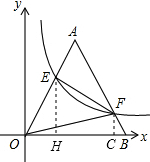 分析 过E点作EH⊥OB于点H,过F点作FC⊥OB于点C,设FB=x,利用等边三角形的性质及锐角三角函数定义表示出FC与BC,进而表示出AF与OC,表示出AE与OE的长,得出OE与EH的长,表示出E与F坐标,根据E与F都在反比例函数的图象上,得到横纵坐标乘积相等列出方程,求出方程的解得到x的值,即可求出实数k的值.