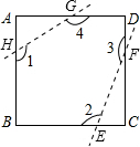 解答 解:如图,六边形BEFDGH的内角和是:(6-2)×180°=720°,则∠1+∠2+∠3+∠4=720°-∠B-∠D=720°-90°-90°=540°.故答案是:540°.