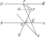 分析 作PM∥CD,如图,则AB∥PM∥CD,根据平行线的性质得∠4=∠2,∠3=∠1,则∠FPH=∠1+∠2,再利用角平分线定义得到∠CFQ=2∠1,∠EGB=2∠BGH,而∠BGH=∠2,所以∠FPH=$\frac{1}{2}$(∠CFQ+∠EGB),利用三角形外角性质得∠EGB=∠E+∠EQG,利用邻补角得∠EQG=180°-∠EQA,利用平行线的性质得∠CFQ=∠EQA,则∠EGB=∠E+180°-∠CFQ,于是得到∠FPH=$\frac{1}{2}$(∠CFQ+∠E+180°-∠CFQ)=$\frac{1}{2}$(20°+180°),然后把∠E=20°代入计算即可.