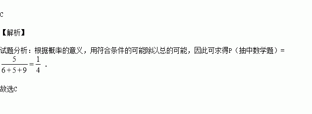 小明在一次班会中参与知识抢答活动,现有语文题6个,数学题5个,综合题9个,他从中随机抽取1个,抽中数学题的概率是( )