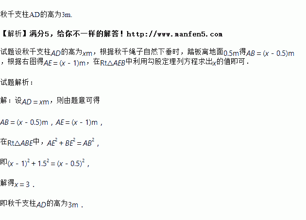 如图是一副秋千架,左图是从正面看,当秋千绳子自然下垂时,踏板离地面0.5m(踏板厚度忽略不计), 右图是从侧面看,当秋千踏板荡起至点B位置时,点B离地面垂直高度BC为1m,离秋千支柱AD的水平距离BE为1.5m(不考虑支柱的直径).求秋千支柱AD的高.