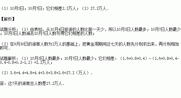 (1)七天内游客人数最多的是哪天,最少的是哪天?它们相差多少万人?