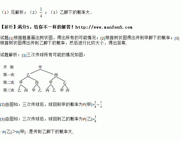 (3)三次传球后,球回到甲脚下的概率大还是传到乙脚下的概率大?