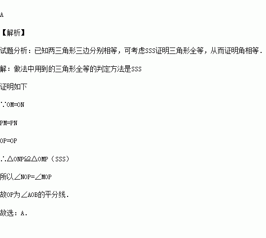 (2015秋•苍溪县期末)工人师傅常用角尺平分一个任意角,做法是:如图在∠AOB的边OA、OB上分别取OM=ON,移动角尺,使角尺的两边相同的刻度分别与M、N重合,得到∠AOB的平分线OP,做法中用到三角形全等的判定方法是( )
