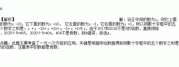 将连续的奇数1,3,5,7,9,……排成如图所示的数表,若阴影十字框上下左右移动,则阴影十字框中的五个数字之和可以是