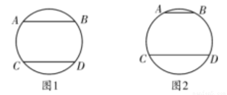 如图1中,弦AB∥CD,AB=CD;图2中,弦AB∥CD,AB≠CD.请仅用无刻度的直尺分别按下列要求画图.