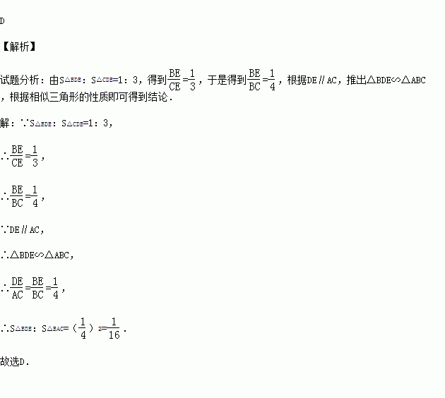 如图,D、E分别是△ABC的边AB、BC上的点,DE∥AC,若S△BDE:S△CDE=1:3,则S△BDE:S△BAC的值为( )