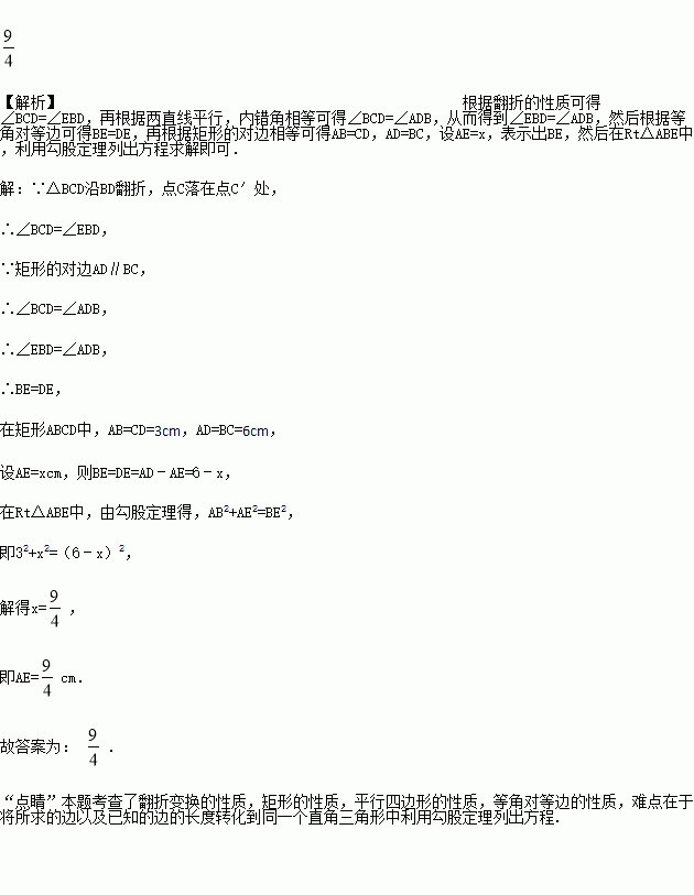 如图,在矩形ABCD中,BC=6cm,CD=3cm,将△BCD沿BD翻折,点C落在点C′处,BC′交AD于点E,则AE的长为______ cm.
