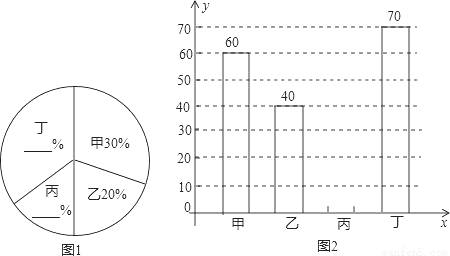 某中学开展“绿化家乡、植树造林”活动,为了解全校植树情况,对该校甲、乙、丙、丁四个班级植树情况进行了调查,将收集的数据整理并绘制成图1和图2两幅尚不完整的统计图,请根据图中的信息,完成下列问题: