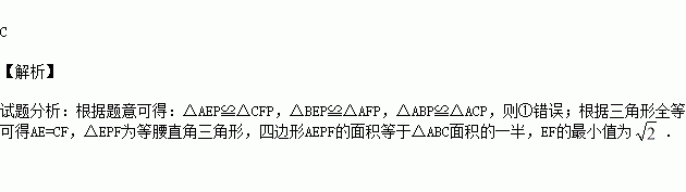 如图,已知△ABC中,AB=AC=2,∠BAC=90º,直角∠EPF的顶点P是BC的中点,两边PE、PF分别交AB、AC于点E、F,给出以下四个结论:①图中只有2对全等三角形,②AE=CF;③△EPF是等腰直角三角形;④S四边形AEPF=