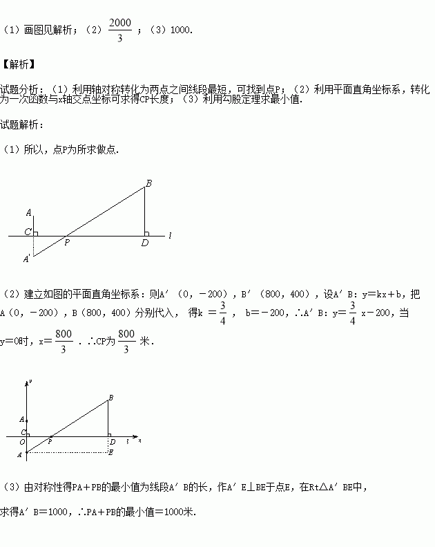 如图,小区A与公路l的距离AC=200米,小区B与公路l的距离BD=400米,已知CD=800米,现要在公路旁建造一利民超市P,使P到A、B两小区的路程之和最短,超市应建在哪?