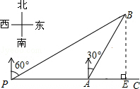 分析 如图,过点B作BE⊥PC于E.通过解直角△ABE得到BE=AE•tan60°=$\sqrt{3}$AE,通过解直角△BPE得到BE=PE•tan30°=$\frac{\sqrt{3}}{3}$PE=$\frac{\sqrt{3}}{3}$(4+AE),据此列出关于AE的方程,由此求得AE的长度,然后通过解△BPE得到PB的长度.