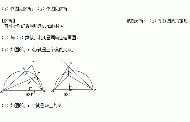 如图AB是半圆的直径,图1中,点C在半圆外;图2中,点C在半圆内,请仅用无刻度的直尺按要求画图.(1)在图1中,画出△ABC的三条高的交点;(2)在图2中,画出△ABC中AB边上的高.(不必写出作图过程,但必须保留作图痕迹)