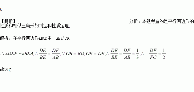如图,在平行四边形ABCD中,AC与BD相交于点O,E是OD的中点,连接AE并延长交DC于点F,则DF:FC=( )