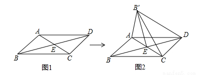 如图,?ABCD中,对角线AC与BD相交于点E,∠AEB=45°,BD=2,将△ABC沿AC所在直线翻折180°到其原来所在的同一平面内,若点B的落点记为B′,则DB′的长为 .