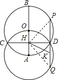 分析 连接CP、CQ,先证得⊙O与⊙A是等圆,得出$\widehat{COD}$=$\widehat{CAD}$,根据圆周角定理得出∠CPQ=∠AQP,从而得出CP=CQ,根据等腰三角形三线合一的性质得出CK⊥PQ,进而就可证得HK=$\frac{1}{2}$CD.