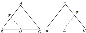 分析:由于动点E从B点出发,沿B→A→C的方向运动,所以分两种情况进行讨论:(1)E点在AB上,设运动时间为t,用含t的代数式分别表示BE,AE,根据条件过D、E两点的直线将△ABC的周长分成两个部分,使其中一部分是另一部分的2倍,求出t值;(2)E点在AC上,同理,可解出t的值.