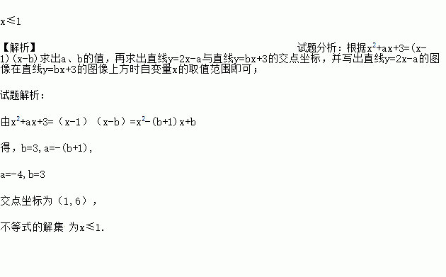 已知x2+ax+3=(x-1)(x-b),试求直线y=2x-a与直线y=bx+3的交点坐标,并直接写出关于x的不等式2x-a≥bx+3的解集。