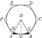分析:由于六边形ABCDEF是正六边形,所以∠AOB=60°,故△OAB是等边三角形,OA=OB=AB=1,设点G为AB与⊙O的切点,连接OG,则OG⊥AB,OG=OA•sin60°,再根据S阴影=S△OAB-S扇形OMN,进而可得出结论.