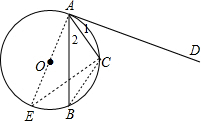 分析:作直径AE,连结CE、CB,如图,根据切线的性质得AE⊥AD,则∠1+∠EAC=90°,再根据圆周角定理,由AE为直径得∠ACE=90°,则利用等角的余角相等得到∠1=∠E,而由圆周角定理得到∠E=∠B,由AC平分∠BAD得到∠1=∠2,所以∠B=∠2,于是根据圆周角定理即可得到