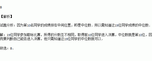 有19位同学参加歌咏比赛,所得的分数互不相同,取得前10位同学进入决赛.某同学知道自己的分数后,要判断自己能否进入决赛,他只需知道这19位同学的( )