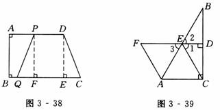 提示:本题的解法充分地体现了方程思想在几何中的应用,同时也体现了数形结合思想.解:由已知得AP=t,CQ=3t,PD=24-t,BQ=26-3t.(1)∵PD∥CQ,∴当PD=CQ时,即3t=24-t时,四边形PQCD为平行四边形,解得t=6.故当t=6时,四边形PQCD为平行四边形. (2)如图3—38所示,作DE⊥BC,PF⊥BC,垂足分别为E,F,则CE=2.当QF=CE时,即QF+CE=2CE=4时,四边形PQCD是等腰梯形.此时有CQ-EF=4,即3t—(24一t)=4,解得t=7.故当t=7时,四边形PQCD为等腰梯形.(3)若四边形ABQP为矩形,则AP=BQ,即t=26—3t,解得t=